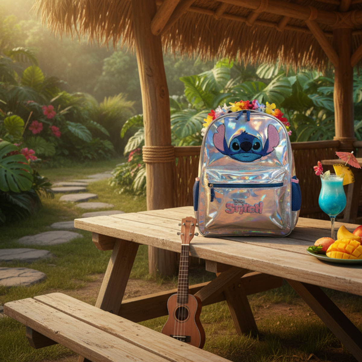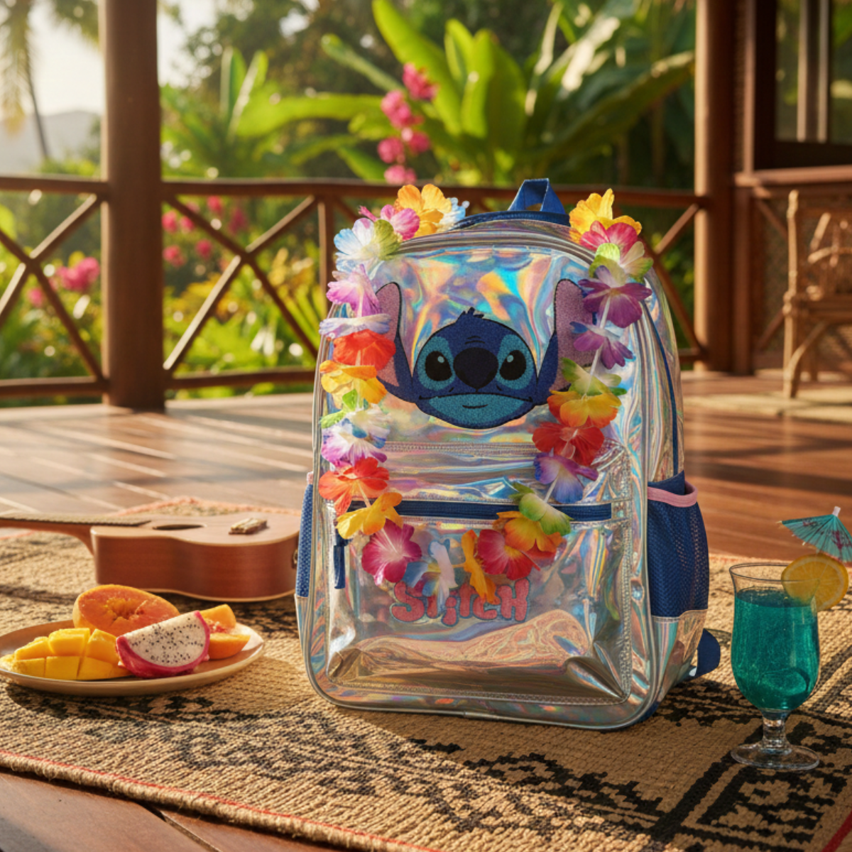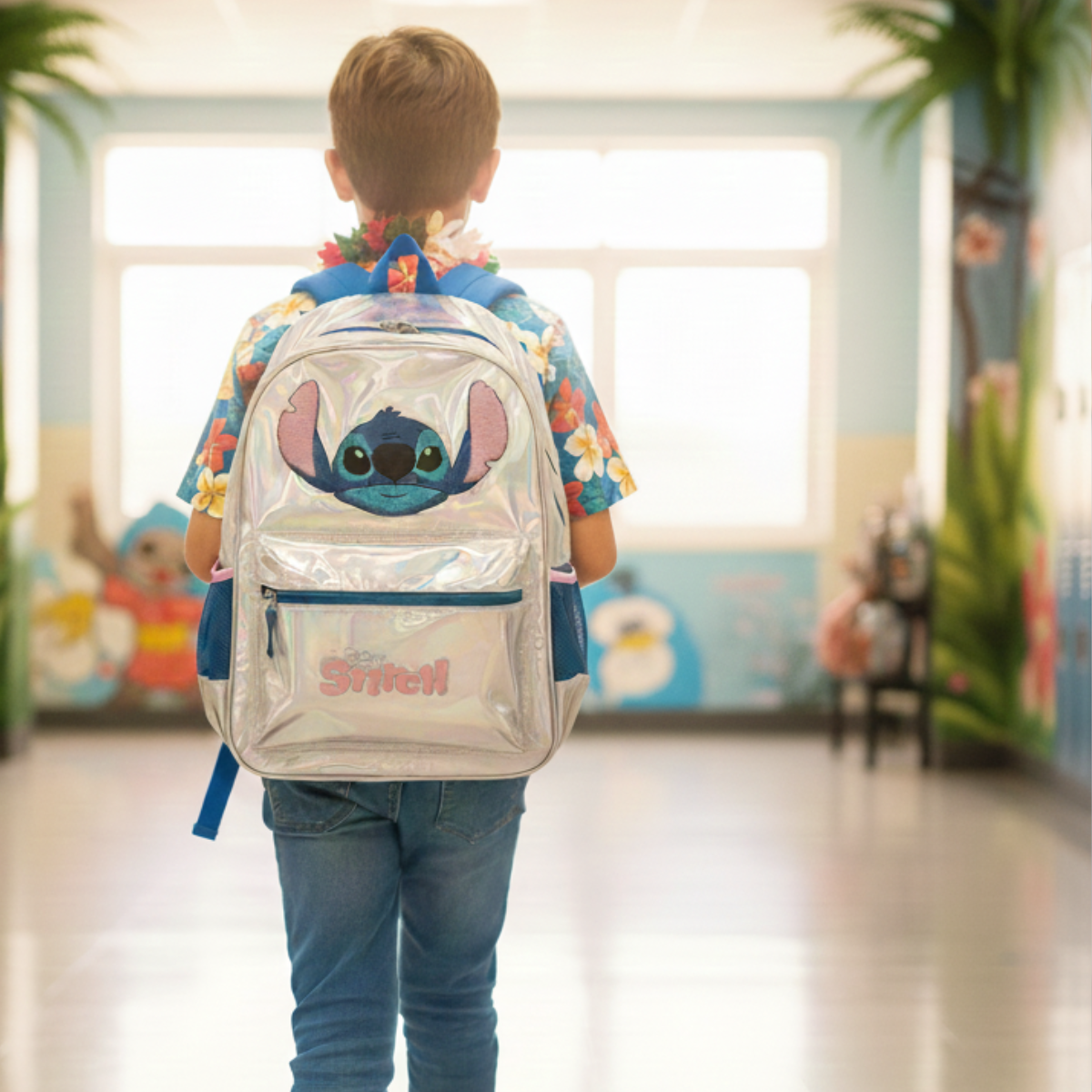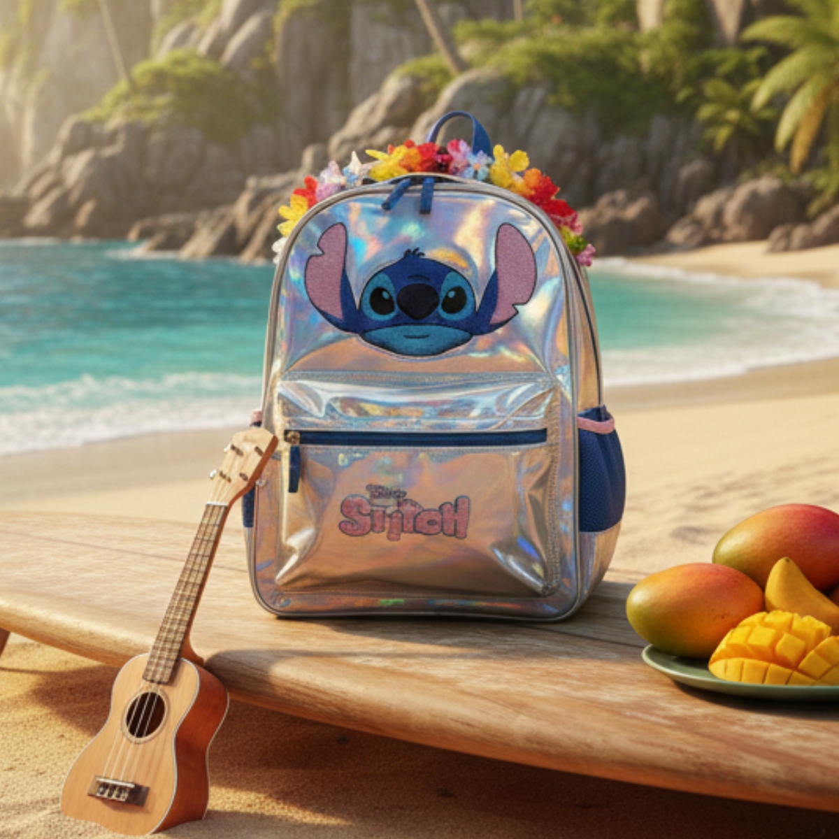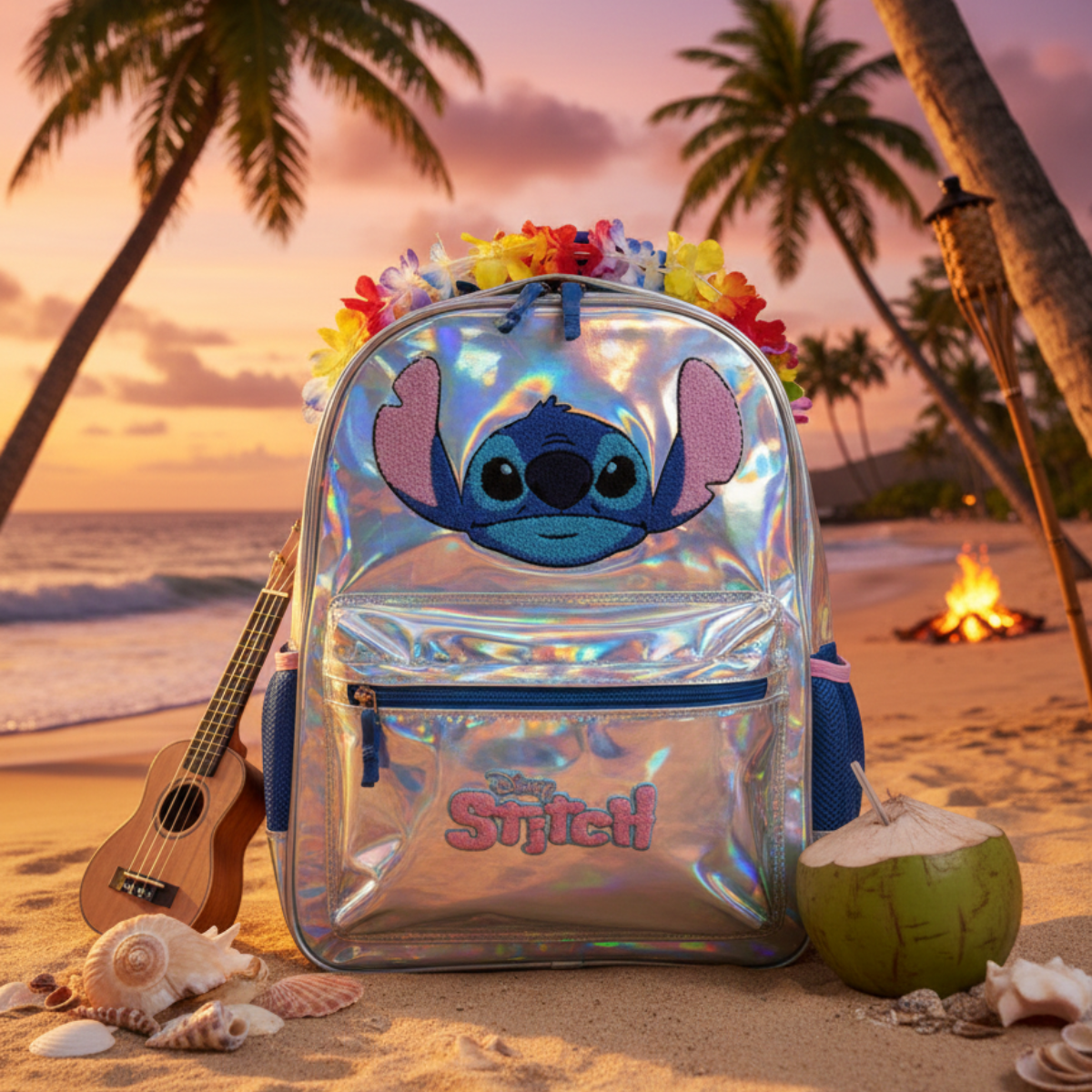 Design Exclusivo Disney: Visual encantador que torna a Mochila Stitch Prata Holográfica ainda mais atrativa.