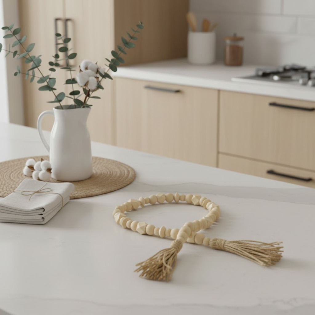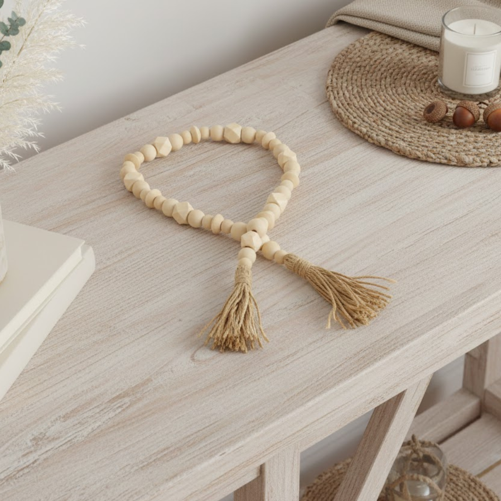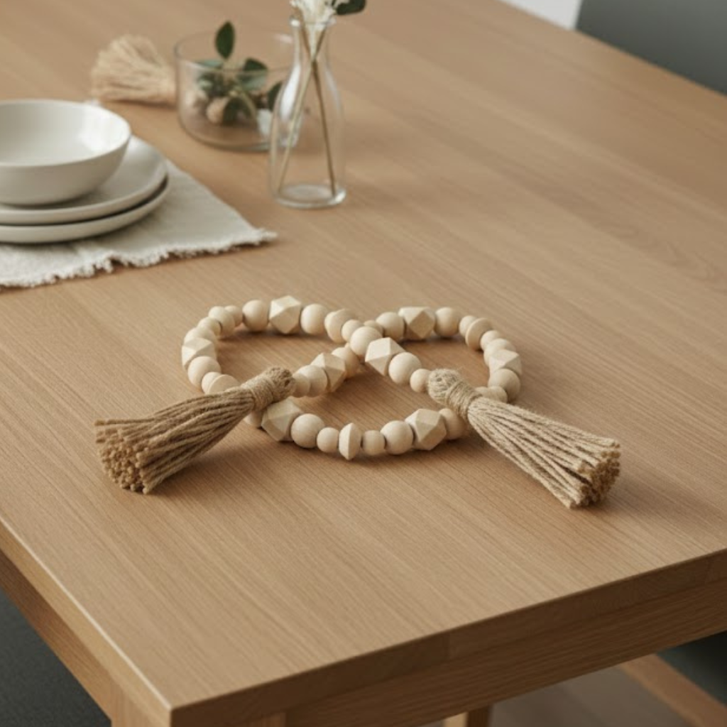Material natural de qualidade: Produzido com contas decorativas em madeira, garantindo durabilidade e beleza atemporal.