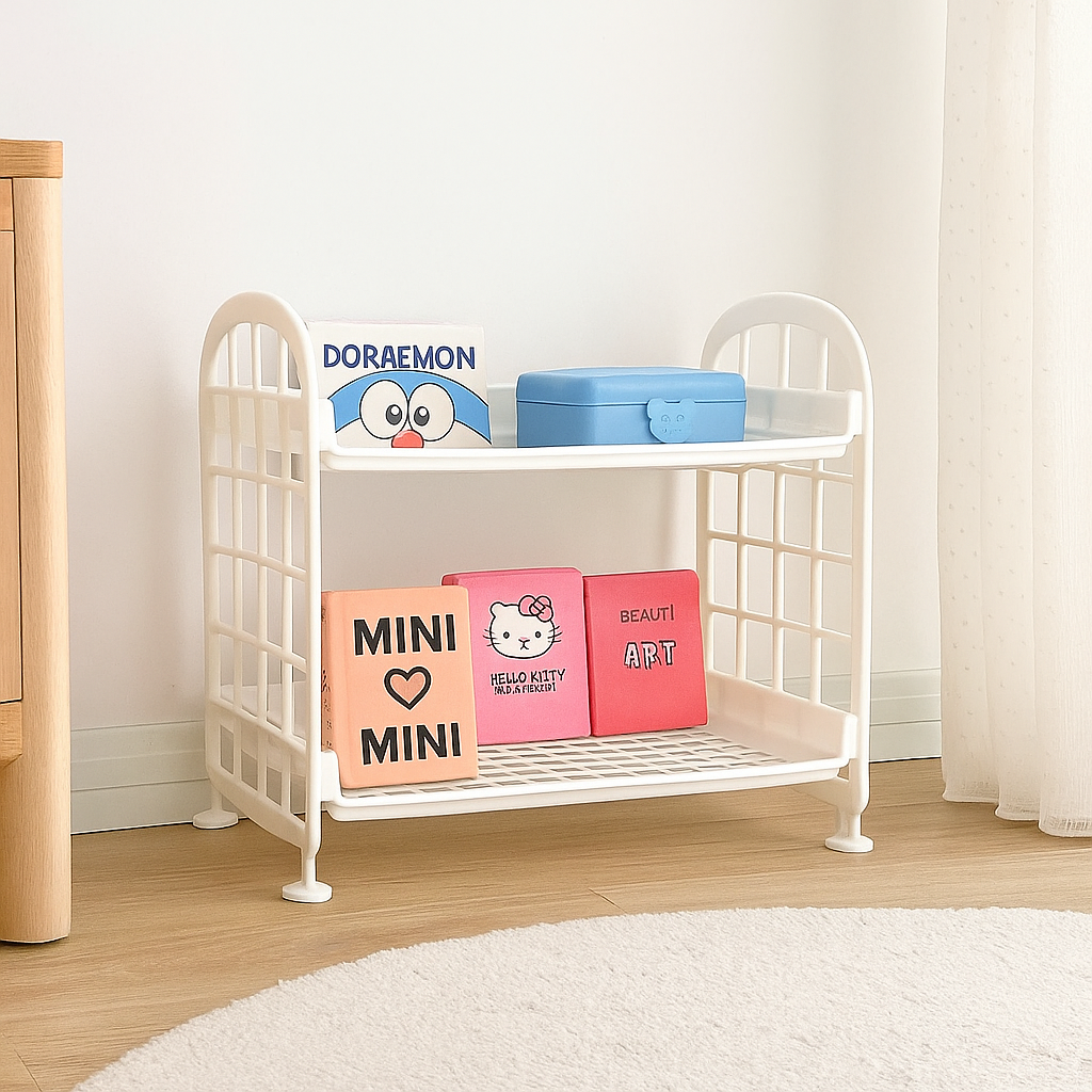 Com duas prateleiras funcionais, a mini estante aproveita o espaço de maneira inteligente, sendo uma excelente opção para organizar pequenos ambientes. Seu tamanho compacto (22x20x14 cm) permite colocá-la sobre móveis, bancadas ou dentro de armários, facilitando o acesso aos itens do dia a dia.