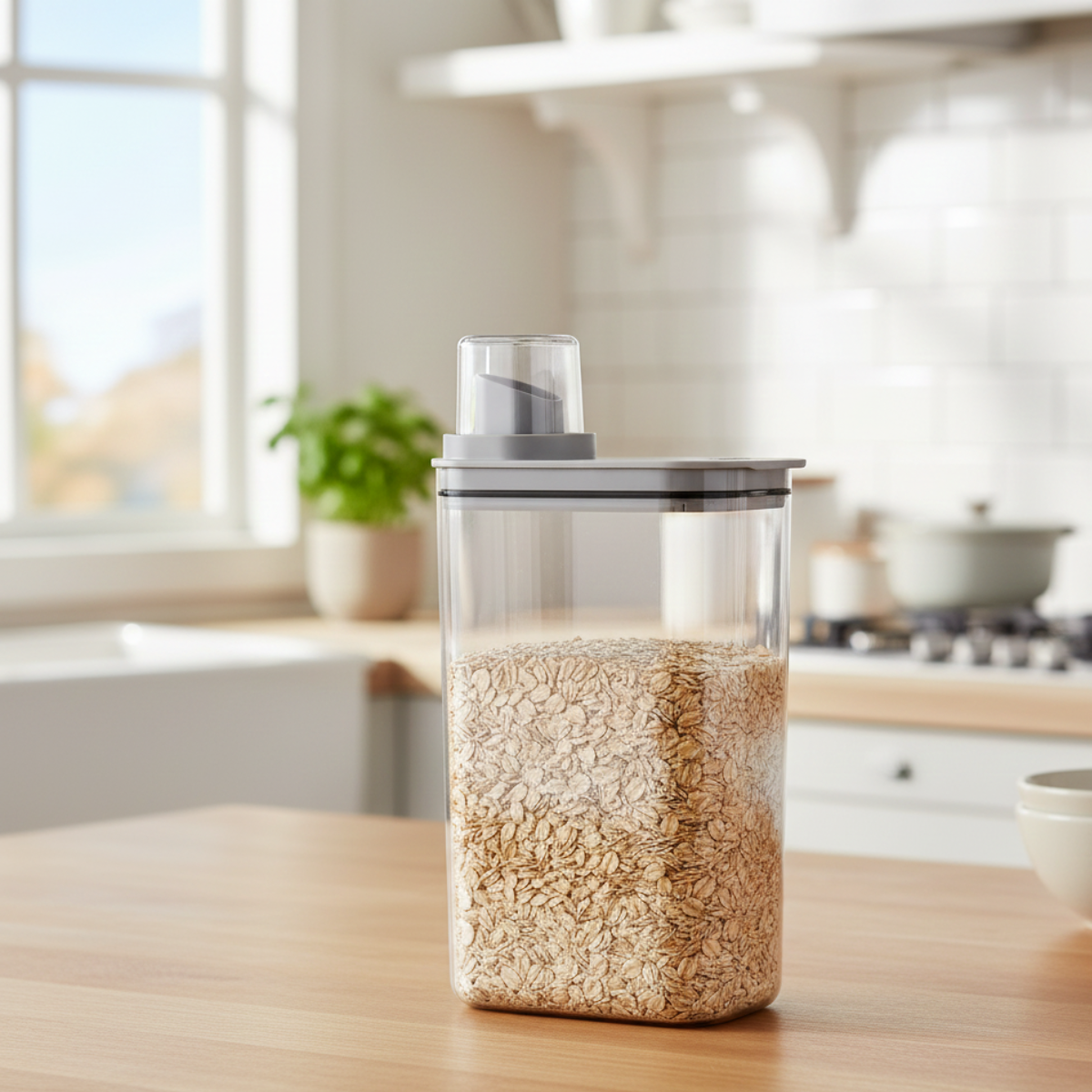 Design Compacto e Moderno: O Organizador Hermético com Bico Dosador se adapta facilmente a prateleiras e armários.