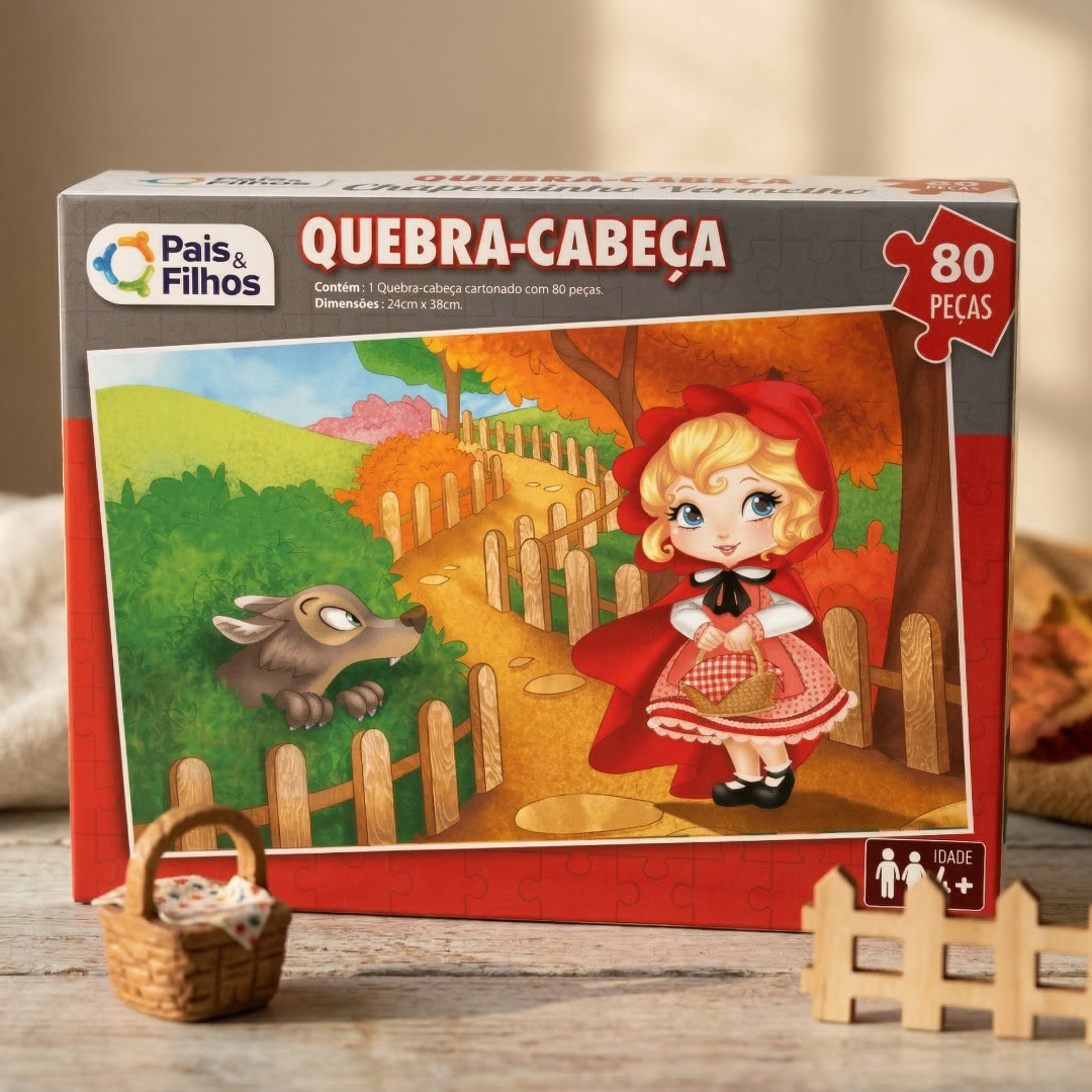A Gala Kids apresenta uma forma mágica de exercitar a mente dos pequenos com muita diversão. Este Quebra-Cabeça Chapeuzinho Vermelho com 80 peças transporta as crianças para o universo dos contos de fadas, permitindo que elas montem a clássica cena da Chapeuzinho Vermelho enquanto desenvolvem a paciência e a percepção visual. É o brinquedo ideal para transformar o aprendizado em um momento lúdico e inesquecível em família.