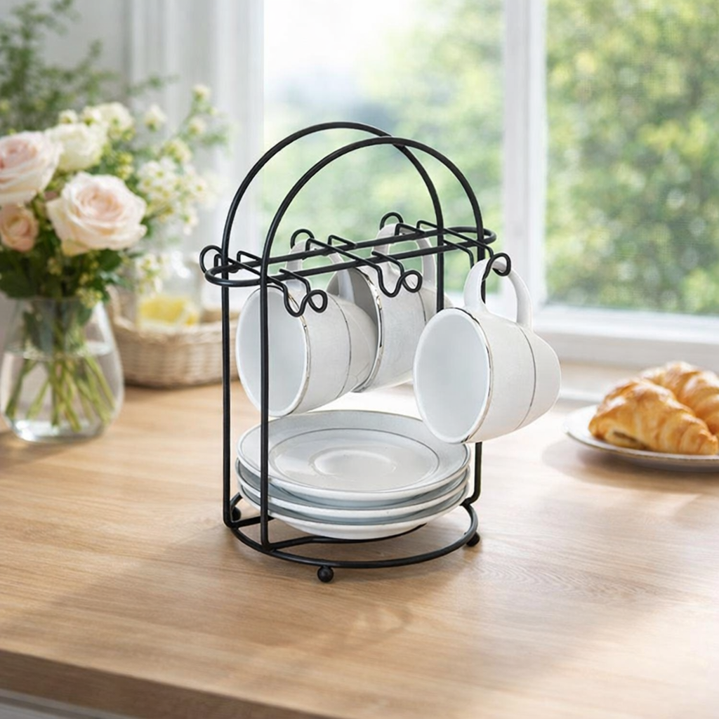 Suporte Preto para Xícara de Chá desenvolvido para quem busca organização, praticidade e um toque elegante na cozinha ou no cantinho do café. Produzido em metal resistente com acabamento preto fosco, este suporte permite armazenar xícaras e pires de forma segura, facilitando o acesso no dia a dia. Seu design vertical otimiza espaço sobre bancadas, mesas ou aparadores, mantendo tudo organizado e visualmente harmonioso. Ideal para uso doméstico, escritórios, áreas gourmet ou espaços de café, ele combina funcionalidade e estética, valorizando a decoração com um estilo moderno e atemporal. Além de proteger as peças contra riscos e quedas, contribui para uma rotina mais prática e organizada, sendo uma excelente escolha para quem aprecia detalhes bem pensados na organização do lar.