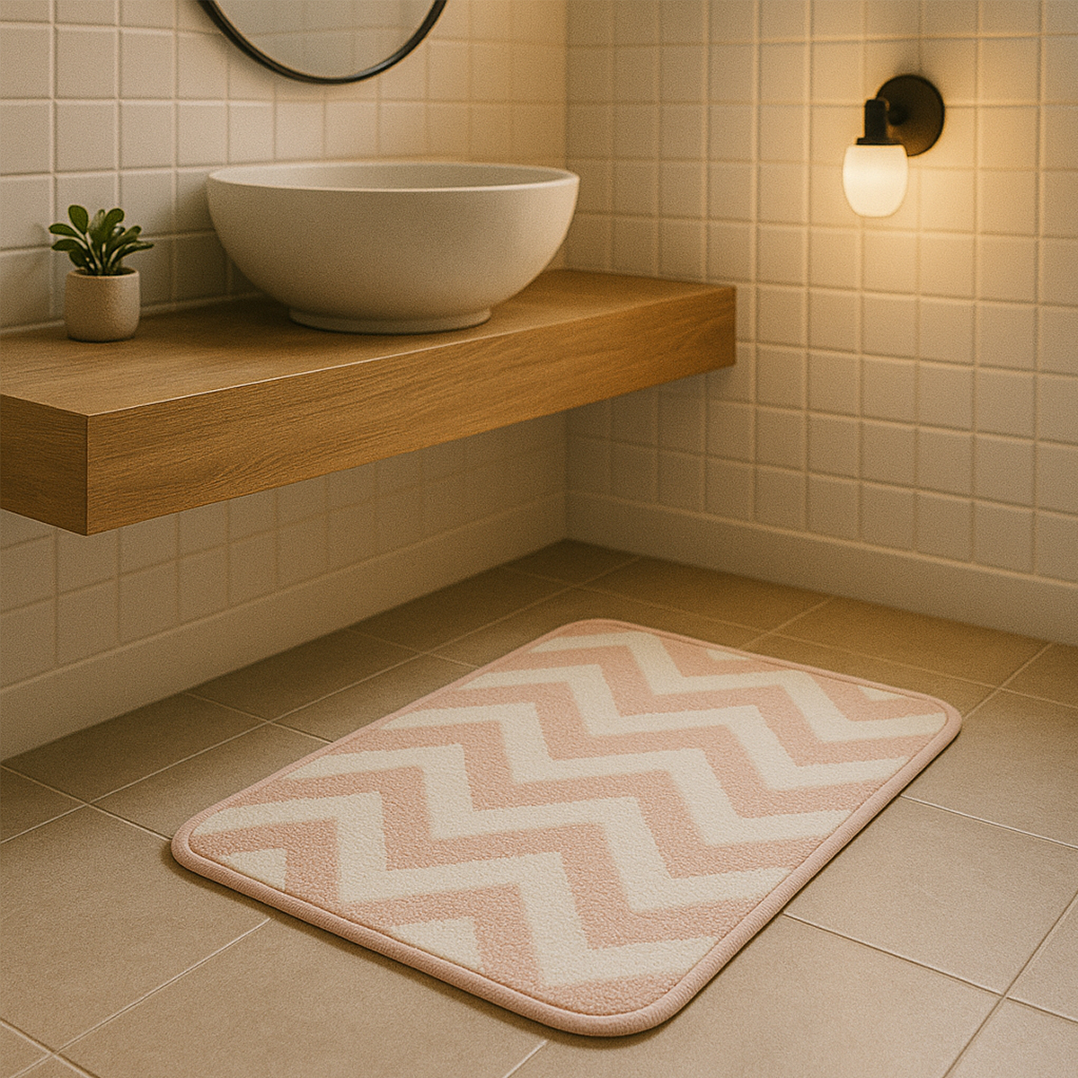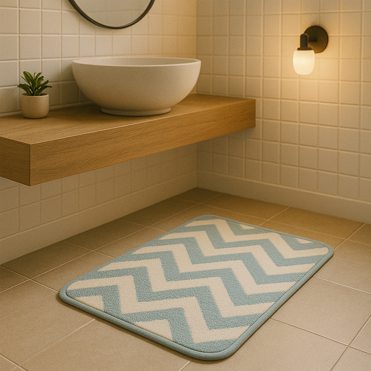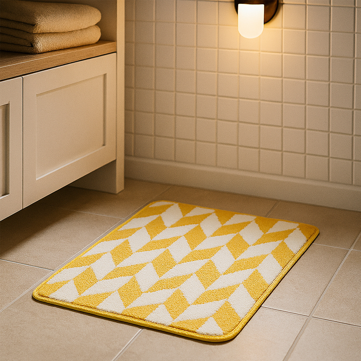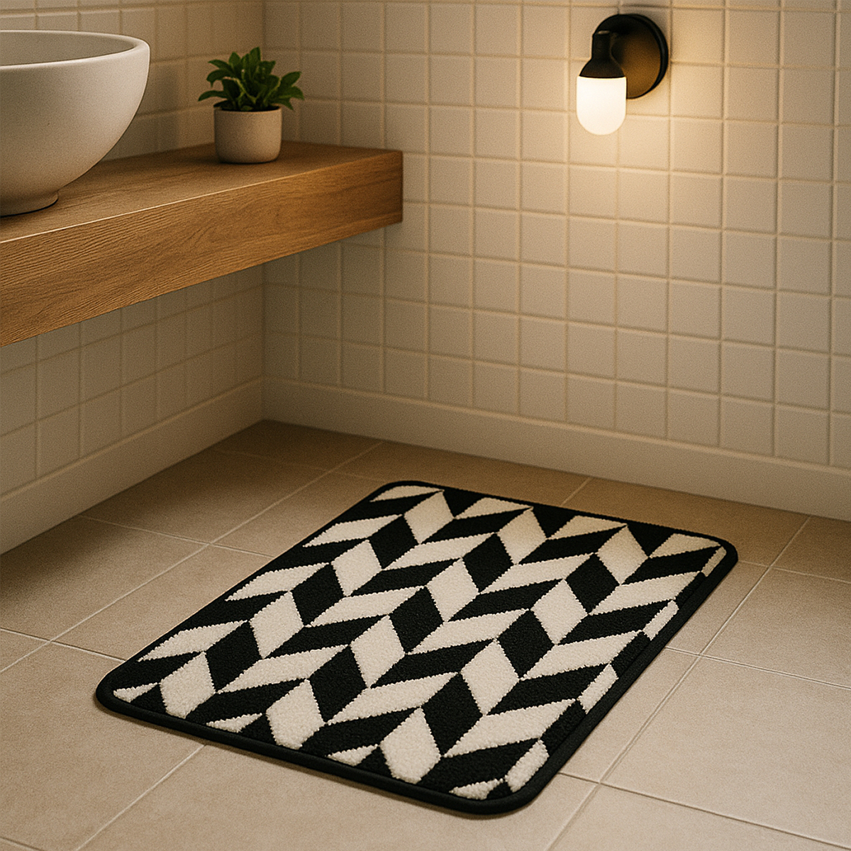 Seu design geométrico moderno se destaca na decoração e combina facilmente com diferentes estilos de ambientes, desde os mais neutros até os mais ousados. Além disso, o tapete é leve, fácil de lavar e seca rapidamente, facilitando a rotina de limpeza sem abrir mão da beleza;