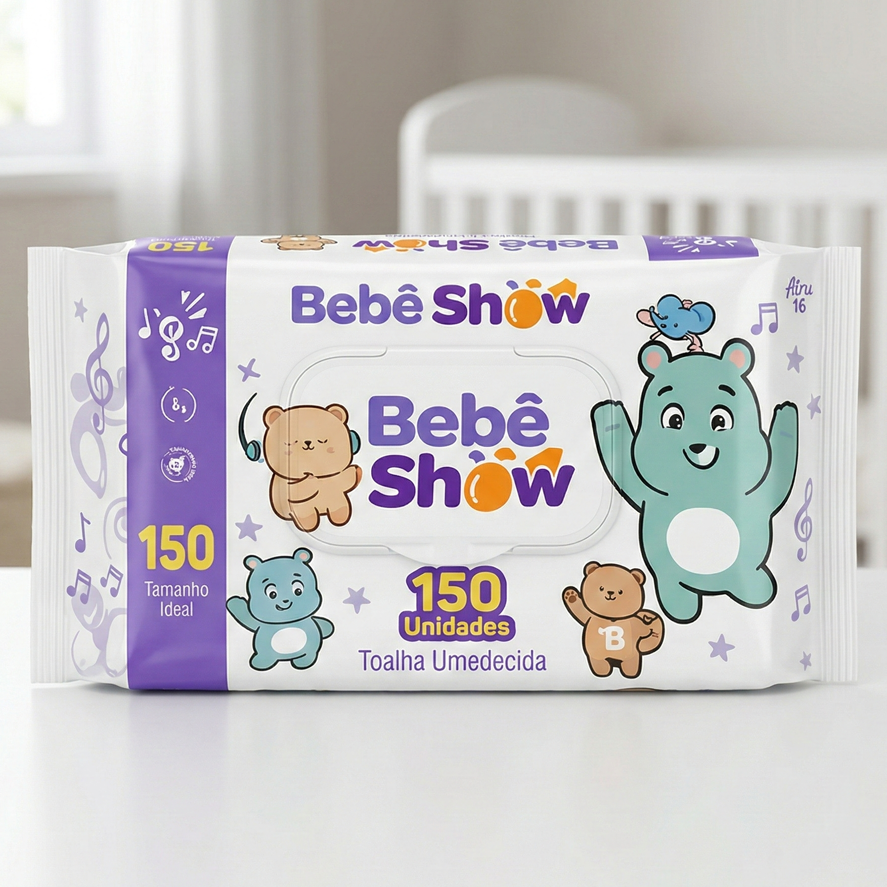 Toalha umedecida 150 unidades Bebê Show ideal para a higiene diária do bebê, com fórmula hipoalergênica, livre de álcool e textura macia que limpa com suavidade e proteção.