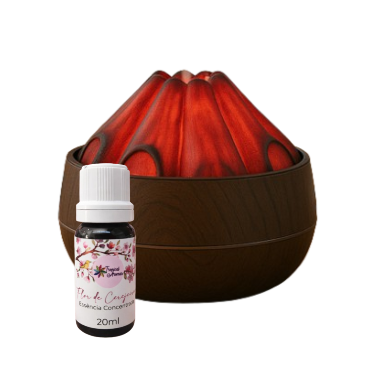 Produto (contém): 01 Umidificador de Ar Lenha Acesa, 01 frasco de essência aromática